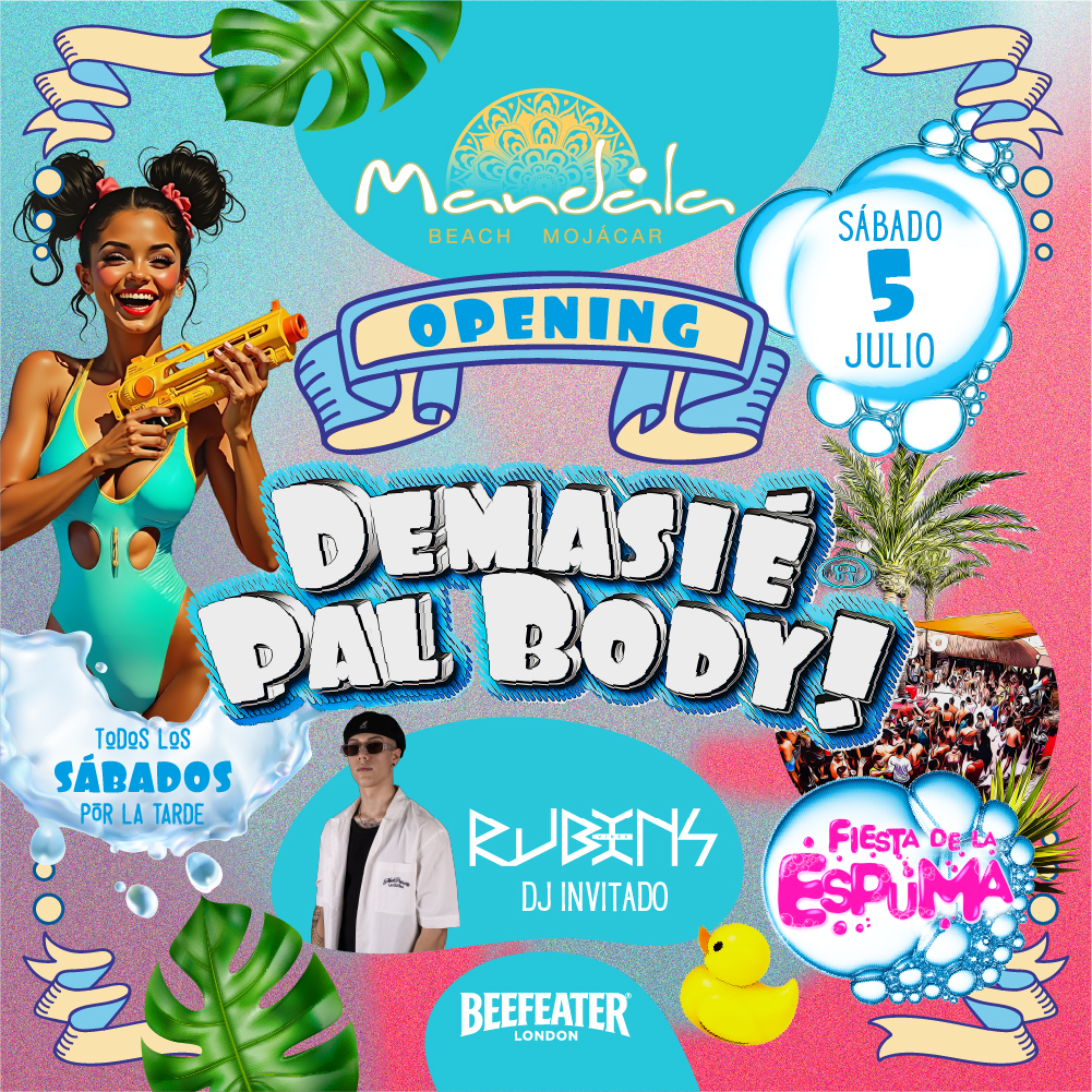 La pool party más divertida de Mojácar. Todos los sábados por la tarde tendremos agua, colchonetas, espuma, muchas risas y patitos de goma.